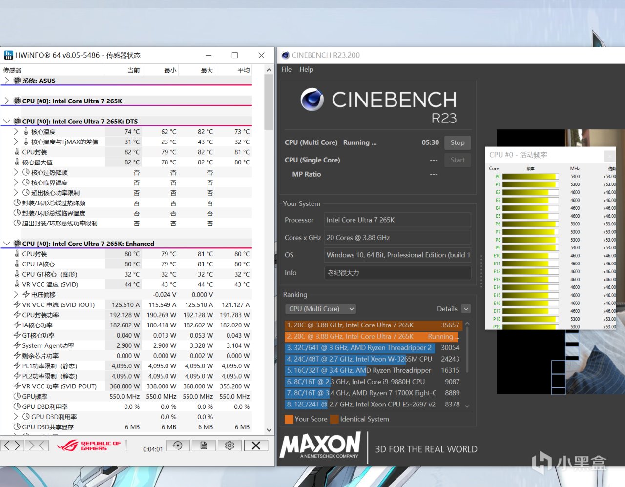 最后测试一下它的散热能力。在使用CINEBENCH R23跑分的同时打开HWiNFO,可以看到运行了4分钟时间内,CPU的功耗为190-192W,并没有出现过热降频的情况。运行时间内CPU的温度稳定在80度左右,从右侧的监视器上可以看到,U7的20核全部满频率,P核5300MHz,E核4600MHz。在极限跑分情况下都这么稳,日常使用时不管玩游戏还是生产力,完全不用担心CPU过热的情况。