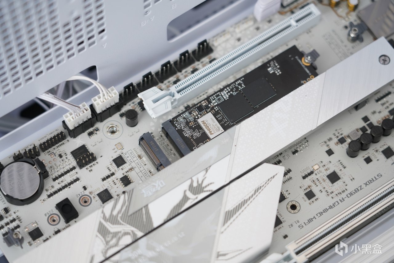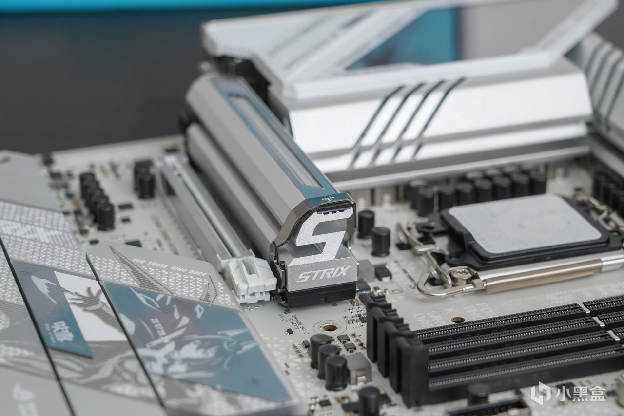 ROG Z890吹雪S有5个M.2插槽,其中主板中心位置的是5.0的,支持PCIe5的M2固态硬盘,可以获得比PCIe4.0更快的读写速度,顶部的“S”型铝合金是硬盘的散热马甲,可以给高速硬盘提供优秀的散热能力。
