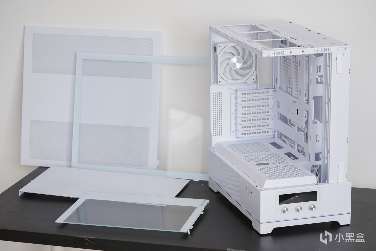 这台机箱的左侧、前面的两块钢化玻璃及顶部、右侧的金属盖板均可取下,这样在装机时会更方便,不会碍手。机箱支持ATX主板和420mm的显卡,CPU散热限高180mm。