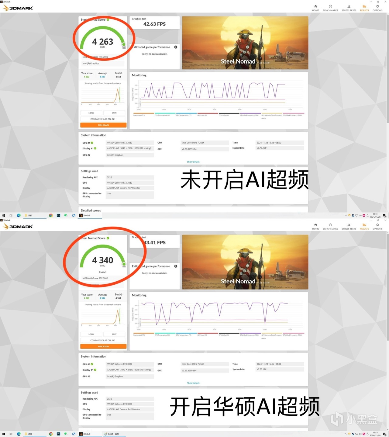 在3D MARK的Steel Nomad Score中,对比也能看出AI超频对整体性能是有提升的。
