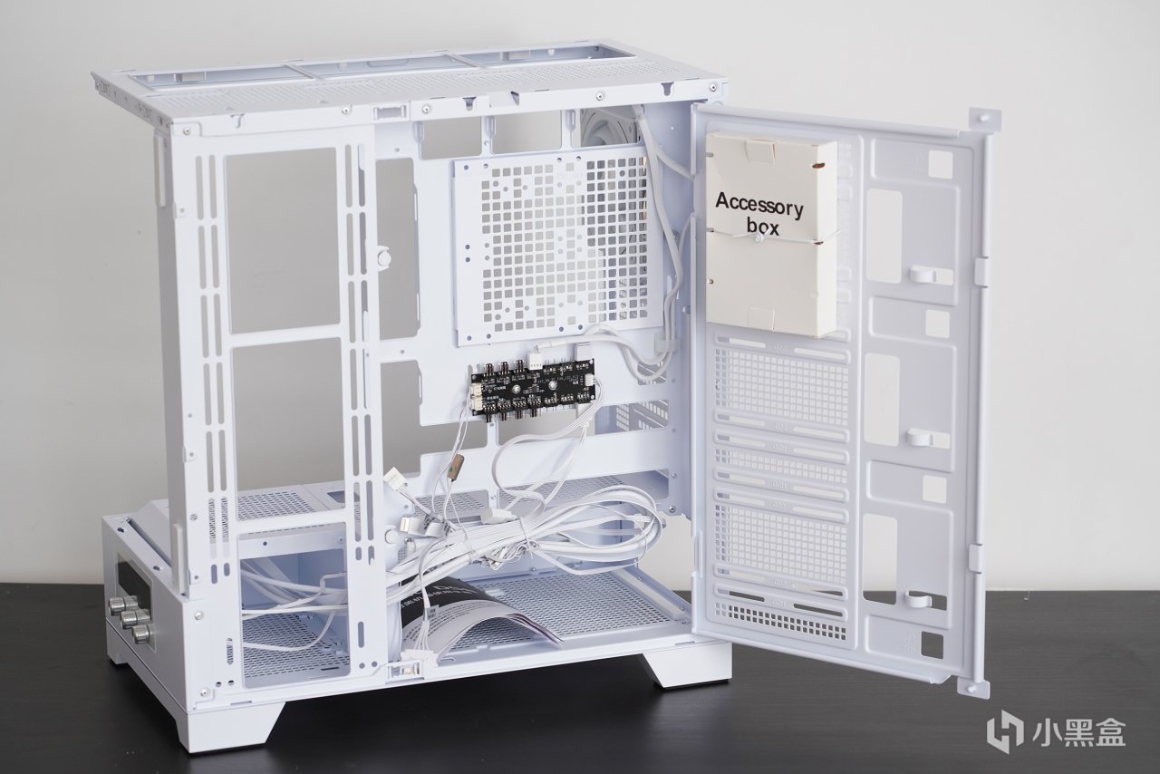 取下背板后,机箱里面还有一个可以放置硬盘的磁吸“门”,无论是机械硬盘还是固态硬盘都可以放在上面,藏在机箱背部,不影响整体美观。