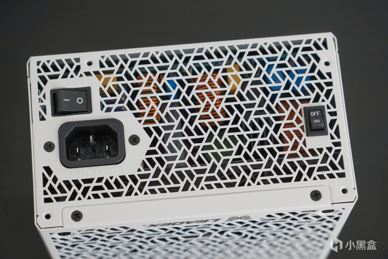 ECO智能温控开关位于下图右侧,有明显的ECO标识。开启这个功能后,开机时电源风扇不转,零噪音输出。当检测到电源温度达到60度,风扇开始运转。电源温度下降到约45度时,风扇停止运转。