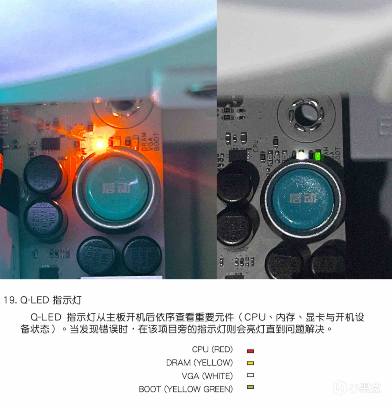 最后要说的是通过这些天应用体验,我个人感觉ROG Z890吹雪S这块玩家国度主板,对DIY玩家尤其是新手特别的友好。主板的QLED故障灯会告诉你哪个硬件有问题。例如我在装机时没有把内存完全插好,QLED直接亮黄灯;显卡没插到位的时候,QLED又亮白灯。对照QLED的说明,即可迅速的发现哪里出错。