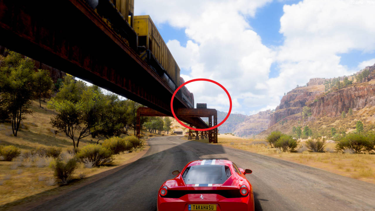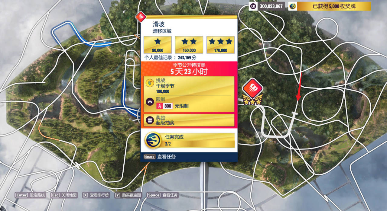 在體育場拍攝法拉利458與冰屋在一起的相片即可觸發寶箱範圍(冰屋在體育場出入口附近,寶箱在鐵道墩子上,這條鐵路是可以上去的),寶箱具體位置如圖,完成獎勵爲300馬拉松點數