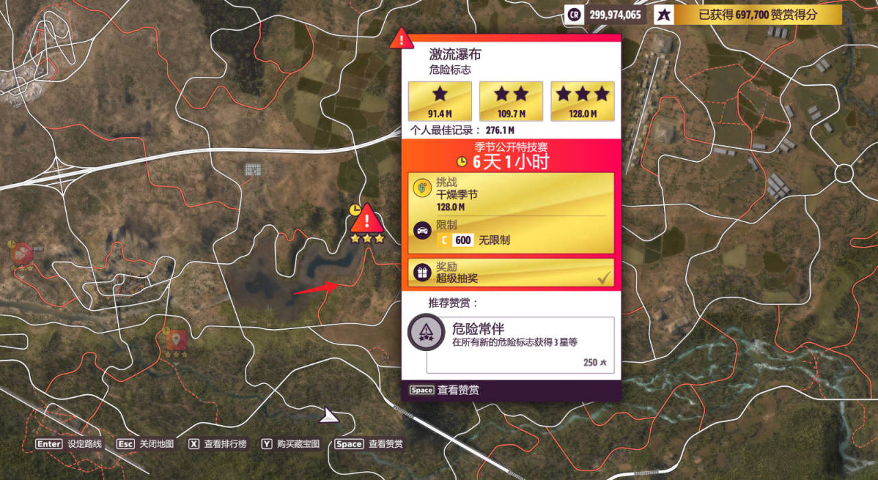 危險標誌:激流瀑布,完成獎勵爲超級抽獎。(建議從箭頭所指處出發,儘量拉遠點)