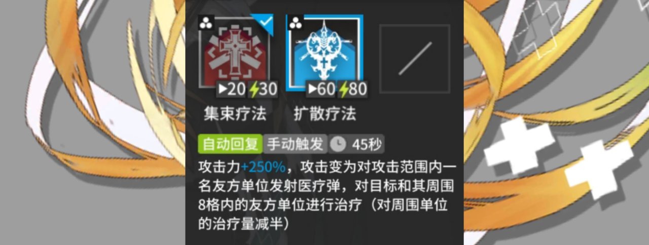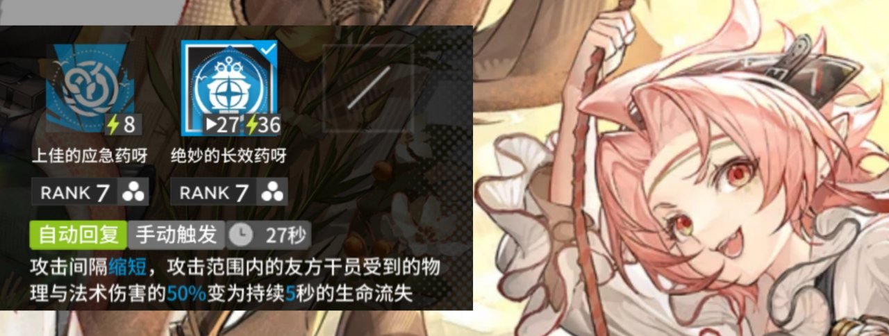 ①技能期间治疗目标数降低几乎没什么影响,治疗量足够高,35秒内触发天赋效果,医疗、辅助干员的生存和抗干扰能力增强,2.85秒攻速不变,35秒内能够持续治疗12次