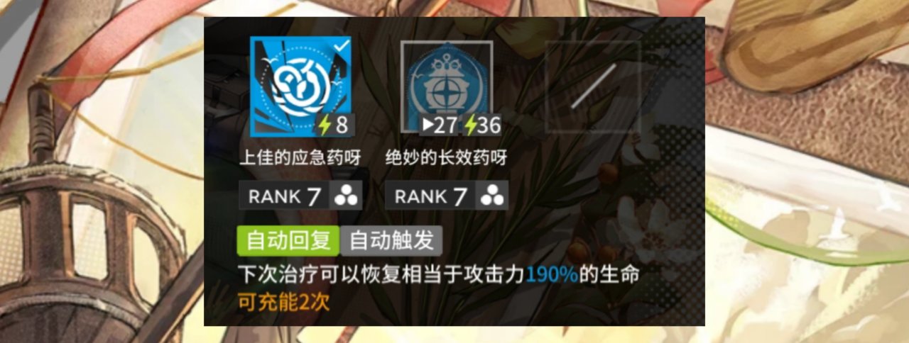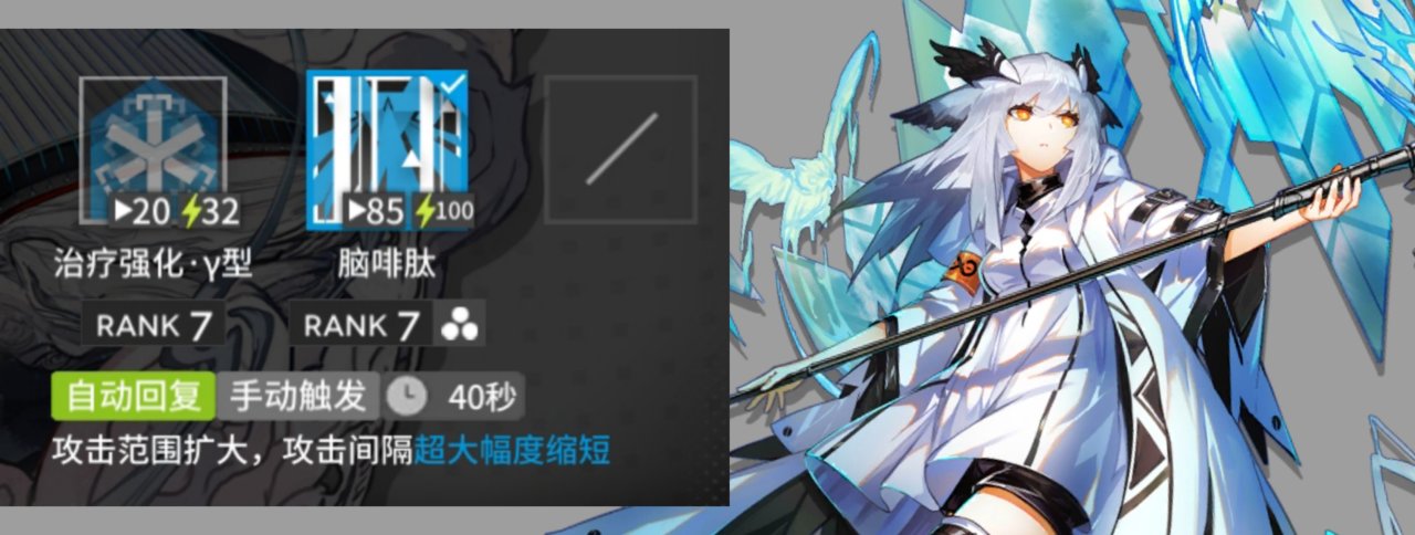 白面鸮①技能和夜莺一样,早期设计思路还不够开阔所以就有这么一个凑数技能,30秒内治疗量提升至458×1.9≈870,基本上白面鸮默认是只有一个技能的五星干员了