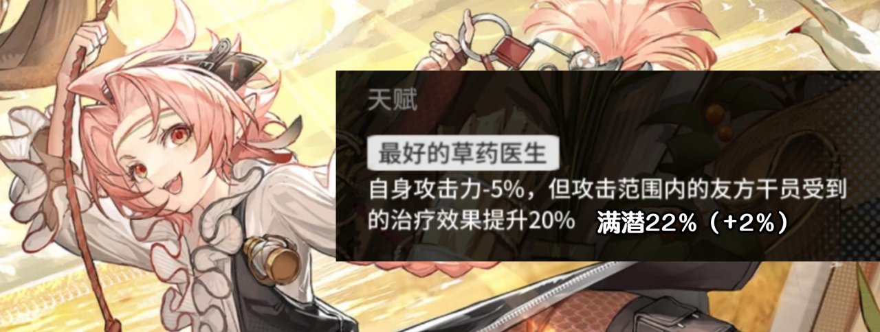 瑰盐天赋自带debuff,部署后攻击降低5%,攻击从407降至≈387,几乎没啥影响,毕竟还有范围内友军治疗量提升22%的重要效果,提升自身奶量,还能拐其他治疗类干员