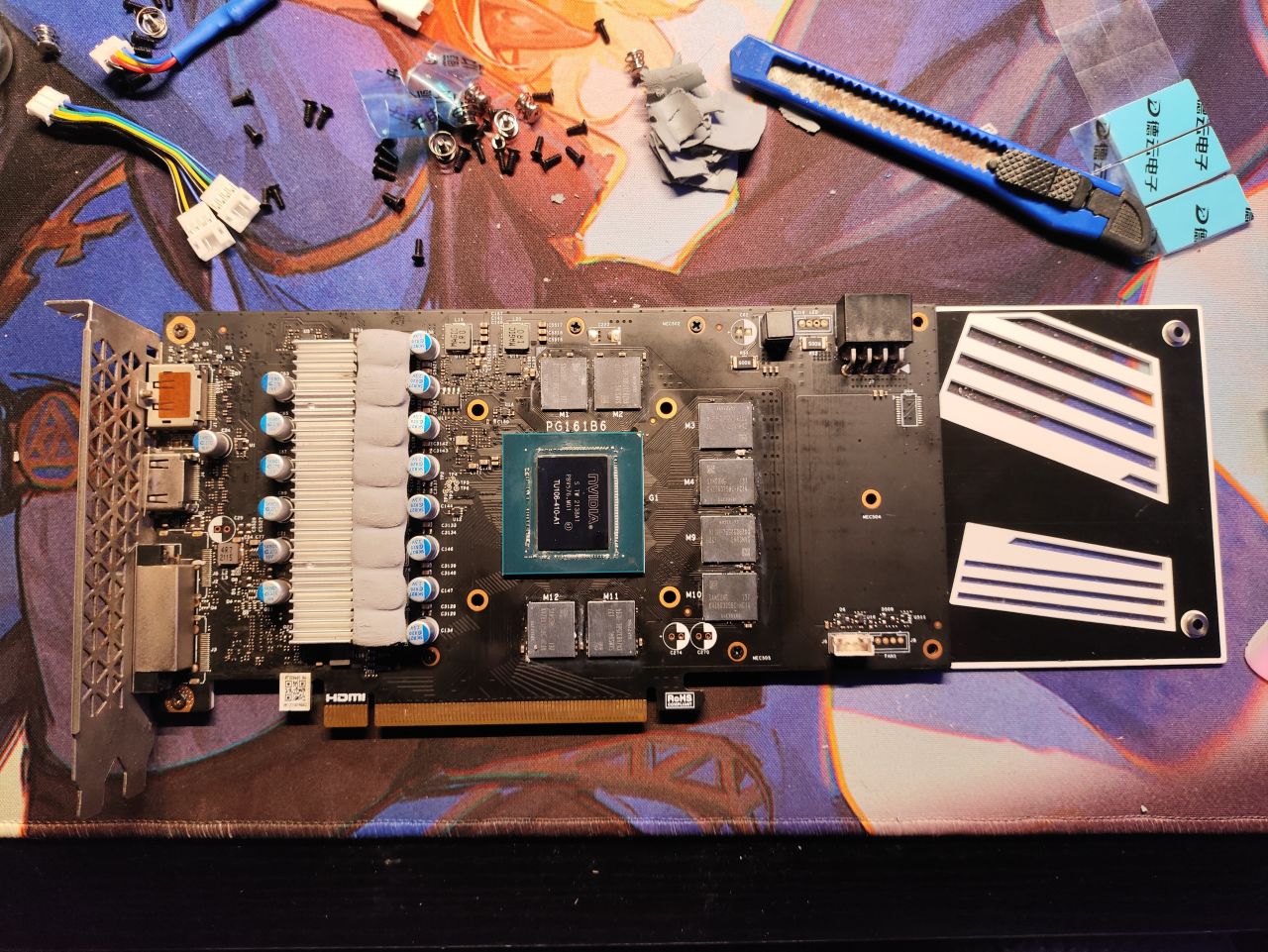 由於2060u是6g顯存的緣故,只帶了適用六顯存顆粒的導熱墊,所以用美工刀切割的時候沒有考慮到2060s有八顆顯存,導致不夠用,手頭上也沒有備用的硅脂墊,但是好在切割的時候爲了能夠接近完美覆蓋顯存,有一些多餘的可以填充剩下的顯存顆粒。