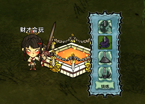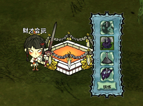 炼制材料为噩梦燃料,蕨叶,灰烬,胡须。炼制480秒。