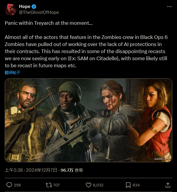 根据《使命召唤》消息泄露者 GhostOfHope 在社交媒体上发布的帖子称,由于动视政策缺乏对 AI 的保护,演员选择离开公司。他写道:“《黑色行动6》僵尸模式中几乎所有僵尸团队的演员都因为合同中缺乏针对 AI 的保护而推出了工作。这导致了我们现在早期看到的一些令人失望的重新选角(例如‘死亡堡垒’中的 SAM),并且未来地图很可能会看到更多重新选角。”