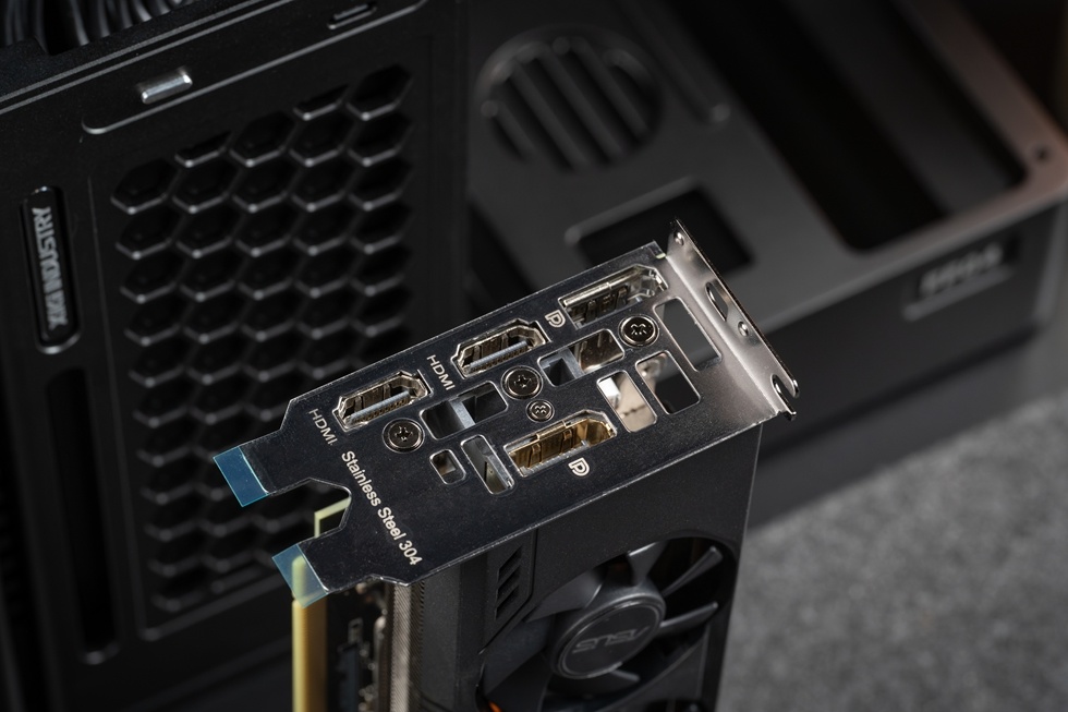 配件中附帶半高擋板,兩個擋板均爲304不鏽鋼材質,全高擋板高度爲120mm,顯卡厚度44mm,擁有2個DP1.4,2個HDMI2.1。