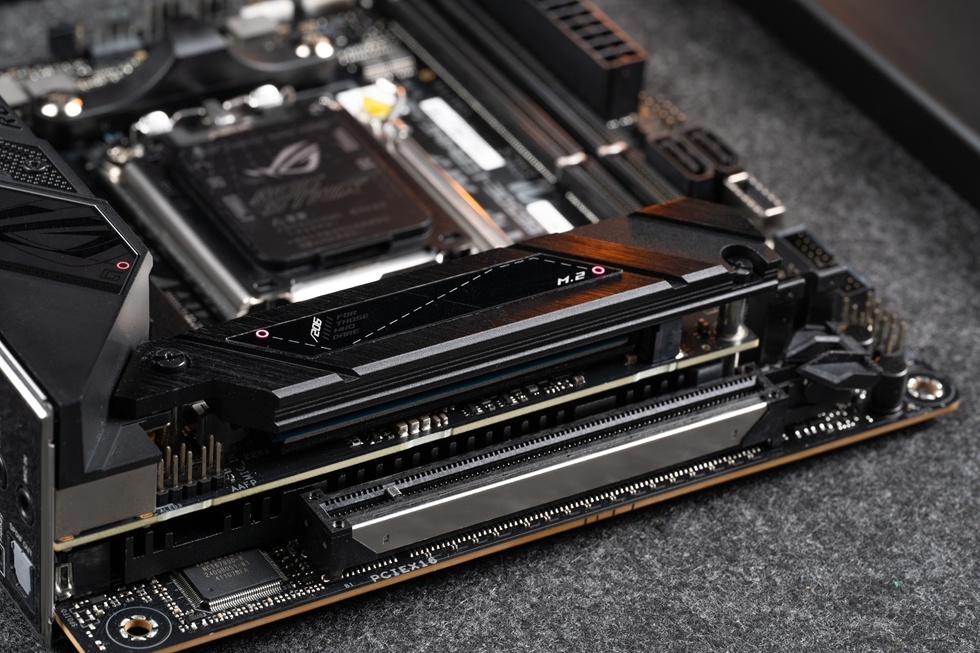 主板配備兩個M.2插槽,其中正面爲PCIe 5.0,背面爲PCIe 4.0。