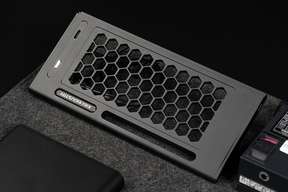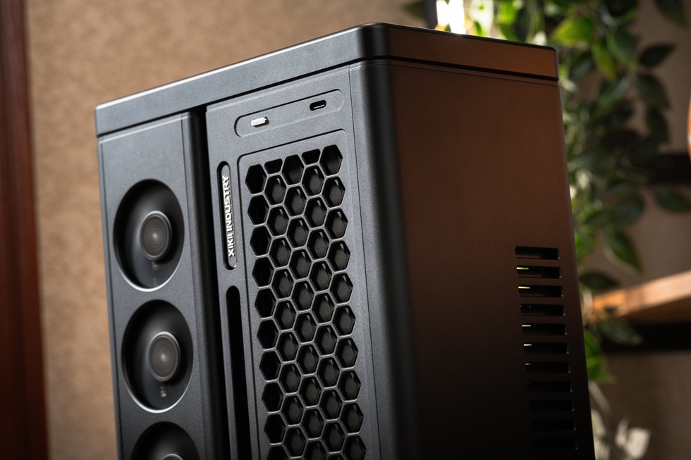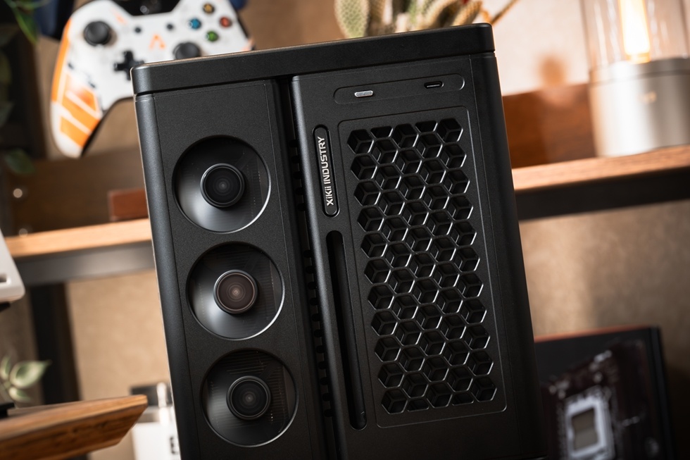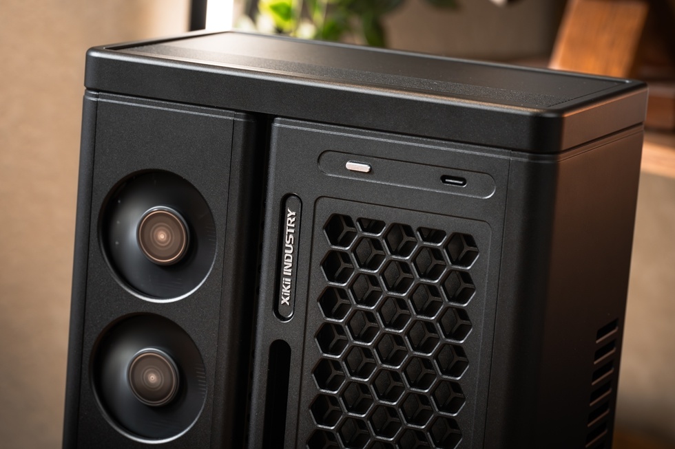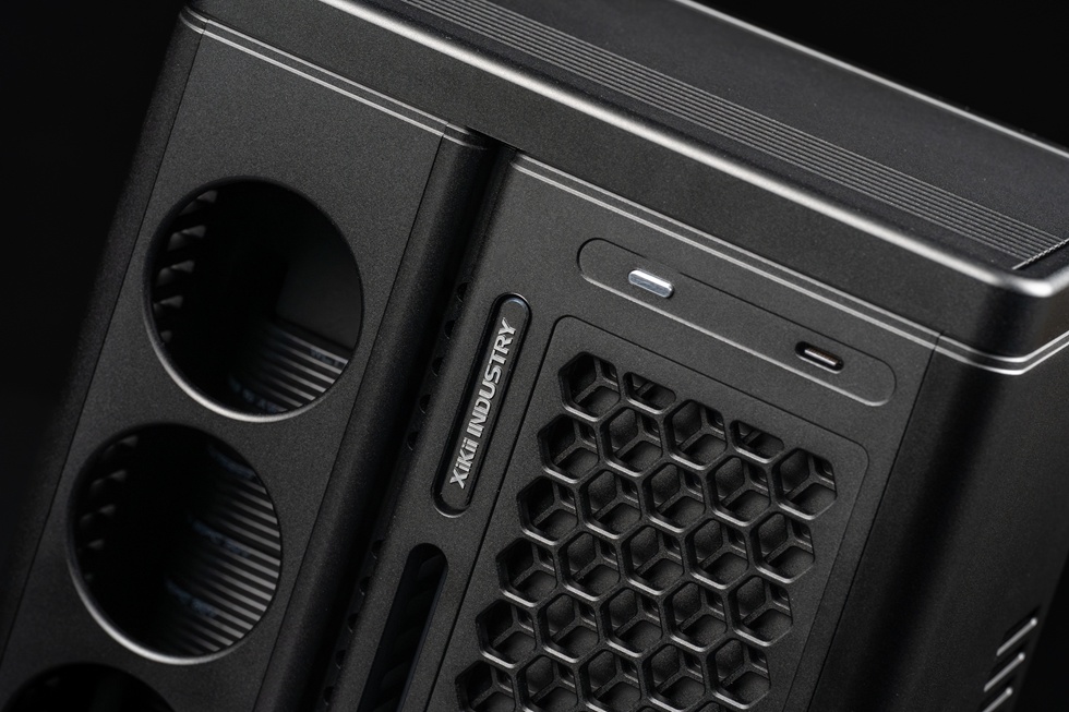 機箱正面有Xikii Industry LOGO標識,右上角爲面板IO,一個開機鍵與一個Type-C接口。