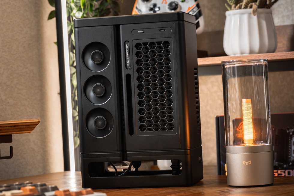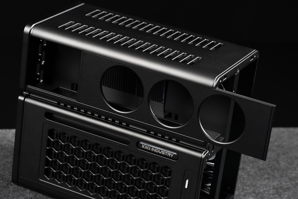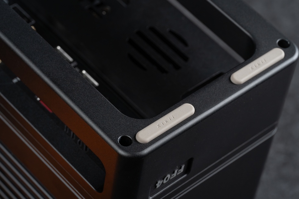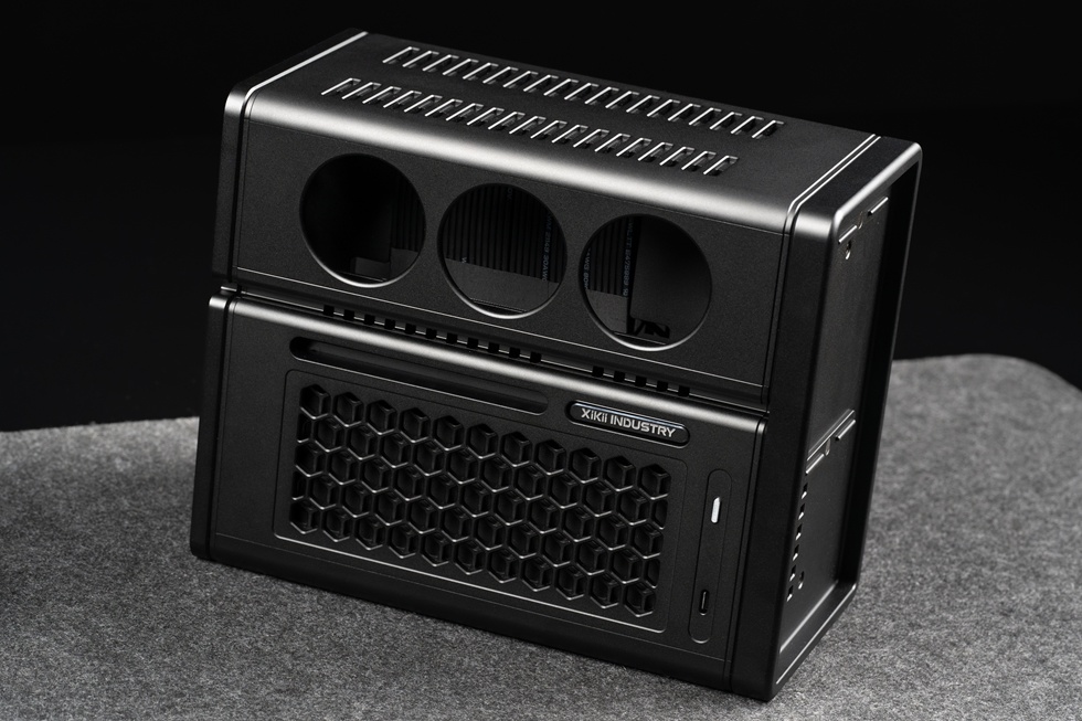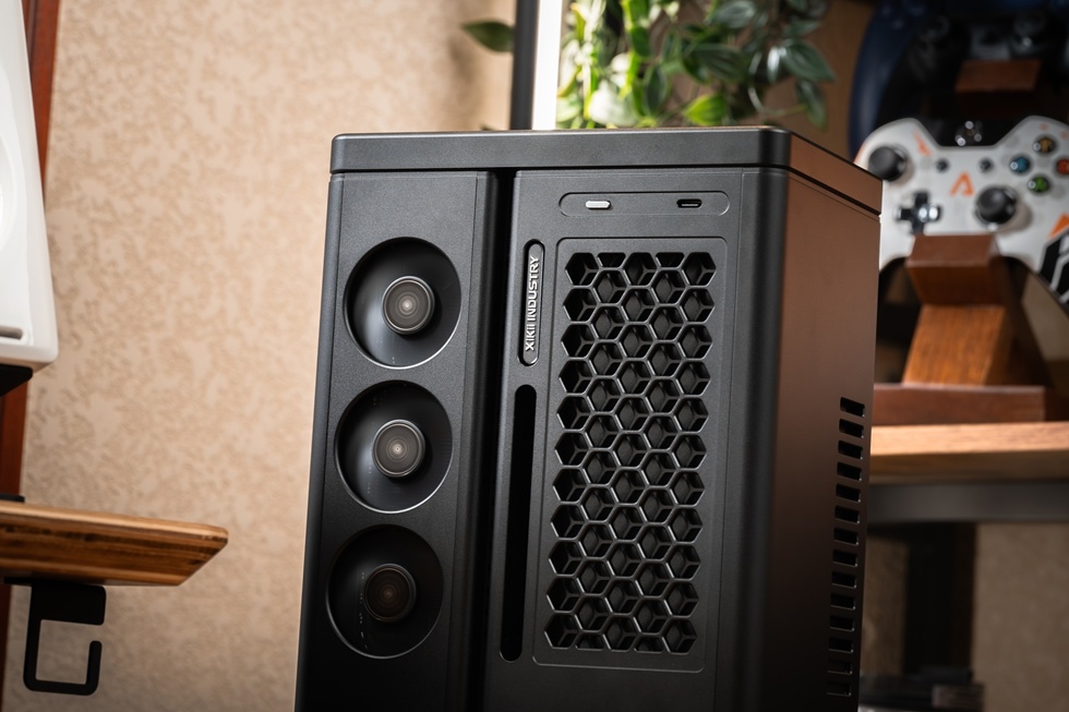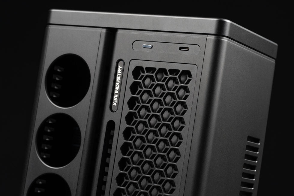 機箱正面有Xikii Industry LOGO標識,右上角爲面板IO,一個開機鍵與一個Type-C接口。
