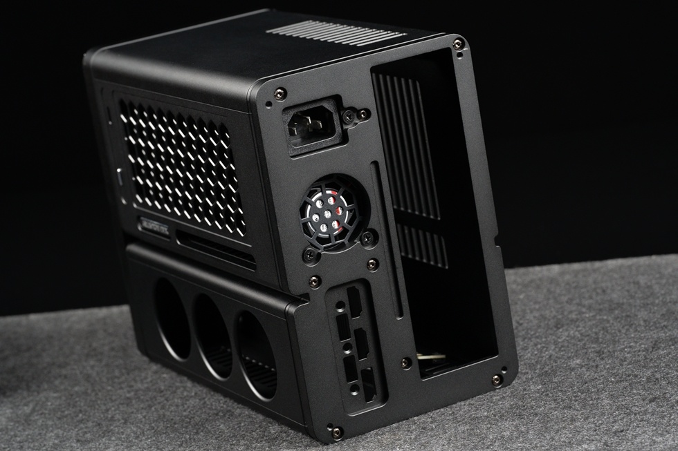 來到機箱尾部,與FF04同樣的設計,機箱設計了顯卡接口開槽,需拆掉顯卡原裝擋板,然後固定在機箱上面,實現一體化。