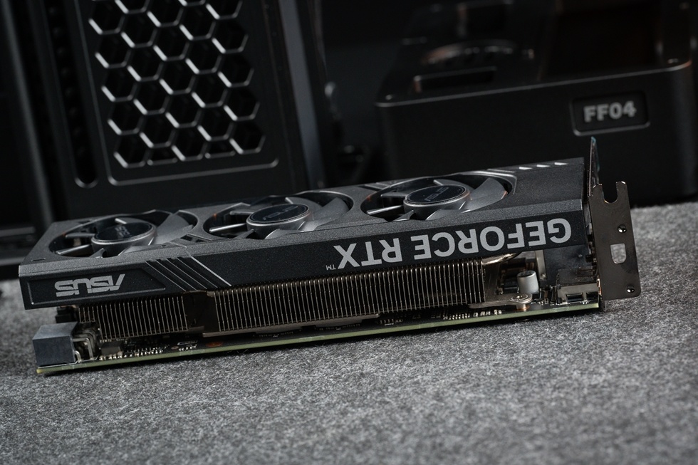 顯卡側面有GeForce RTX與ASUS標識,並且側面爲大面積開放式散熱設計,方便顯卡排熱。