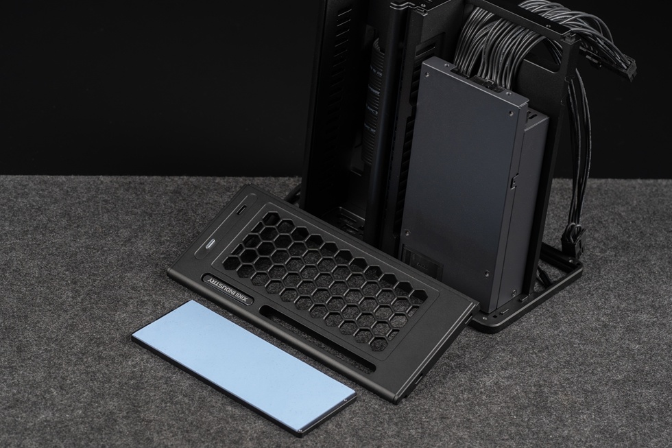 電源位置側板拆解,可見在蜂窩網格下還有一片貼有導熱墊的鋁板,幫助電源進行散熱。