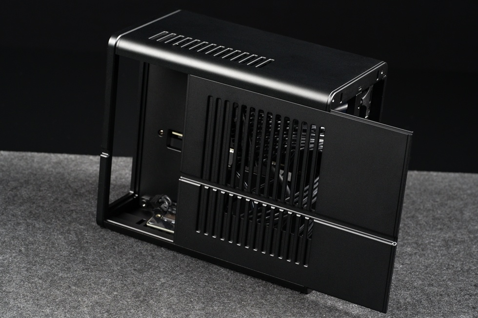 來到機箱背面一側則爲主板的安裝位置,主板面與機箱側面預留了大量的格柵進氣開孔,來保證CPU主板的散熱效率,裝機需採用下壓散熱器,高度支持最高40mm,最佳選擇爲36mm左右高度的下壓散熱器。