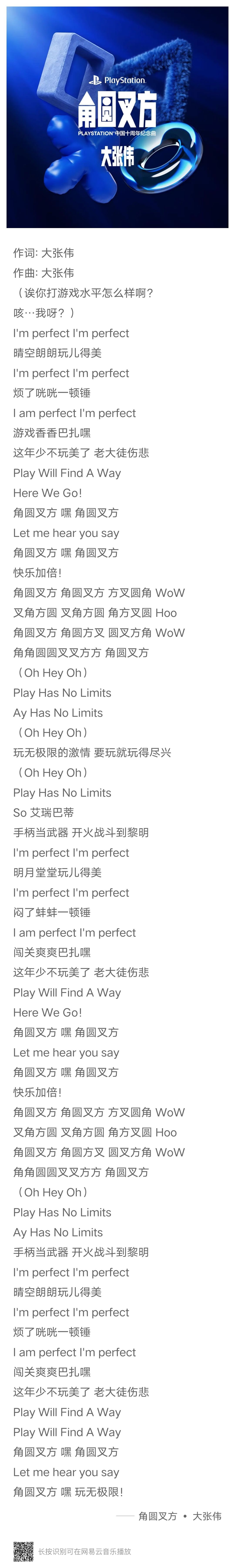 作爲一位「大」玩家,大張偉以他獨特的音樂視角和玩心爆棚的態度,創作了這首《角圓叉方》,用音樂表達出“放開去玩,就能玩無極限”的玩家精神。歌曲不僅慶祝PlayStation 10週年,更是一份送給全球玩家的充滿玩心的小禮物,鼓勵大家無論是在現實生活中還是遊戲世界裏,都能將自己熱愛的事物“玩兒美了”。