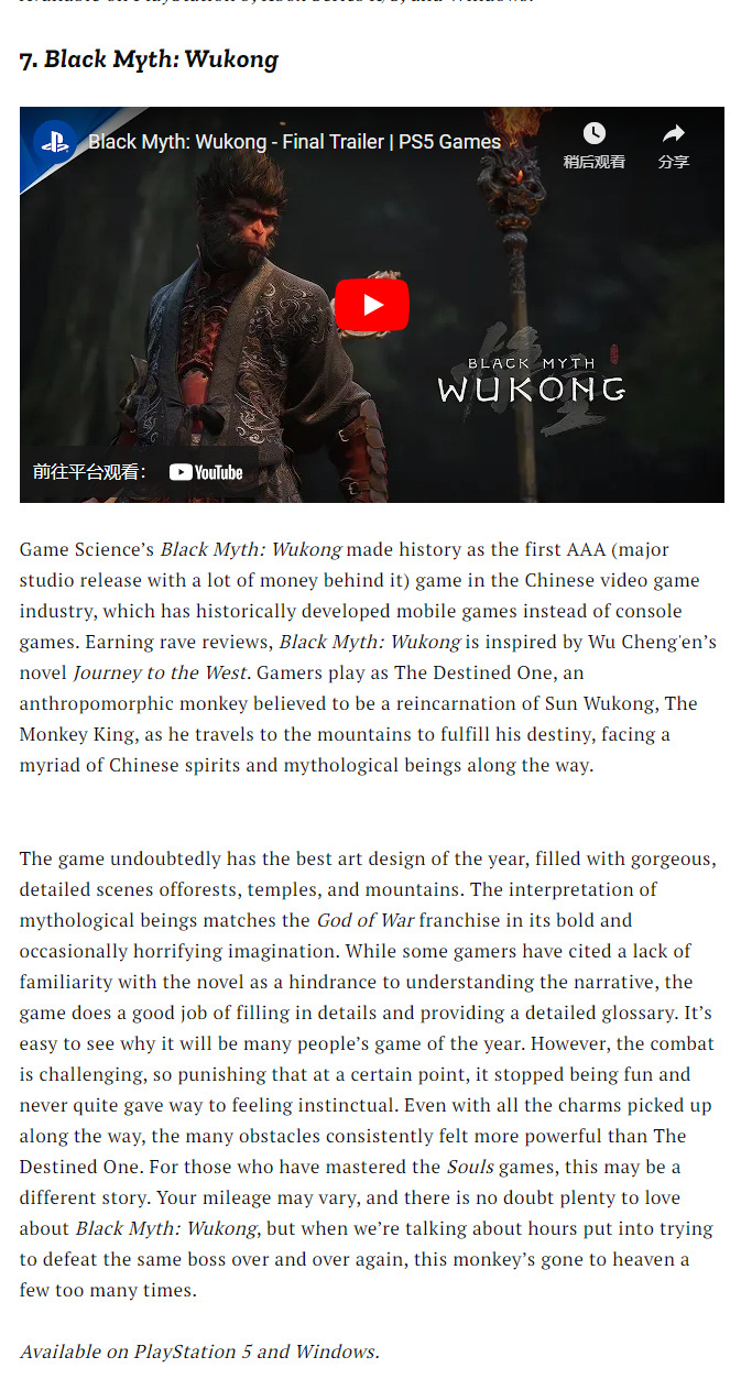該雜誌還評選了十款遊戲,《龍騰世紀:影障守護者》位居榜首。《宇宙機器人》和《最終幻想7:重製版》分別位居第二和第三。2024年最大熱門遊戲《黑神話:悟空》卻排在了第七位。