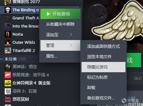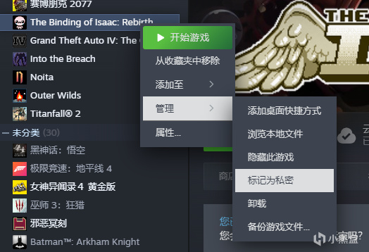 這個時候我們只需要右鍵遊戲,點擊“管理”,就可以將遊戲設置爲私密,這樣好友就看不到你關於這款遊戲的任何信息(包括是否正在遊戲,是否擁有,和關於遊戲的動態等)