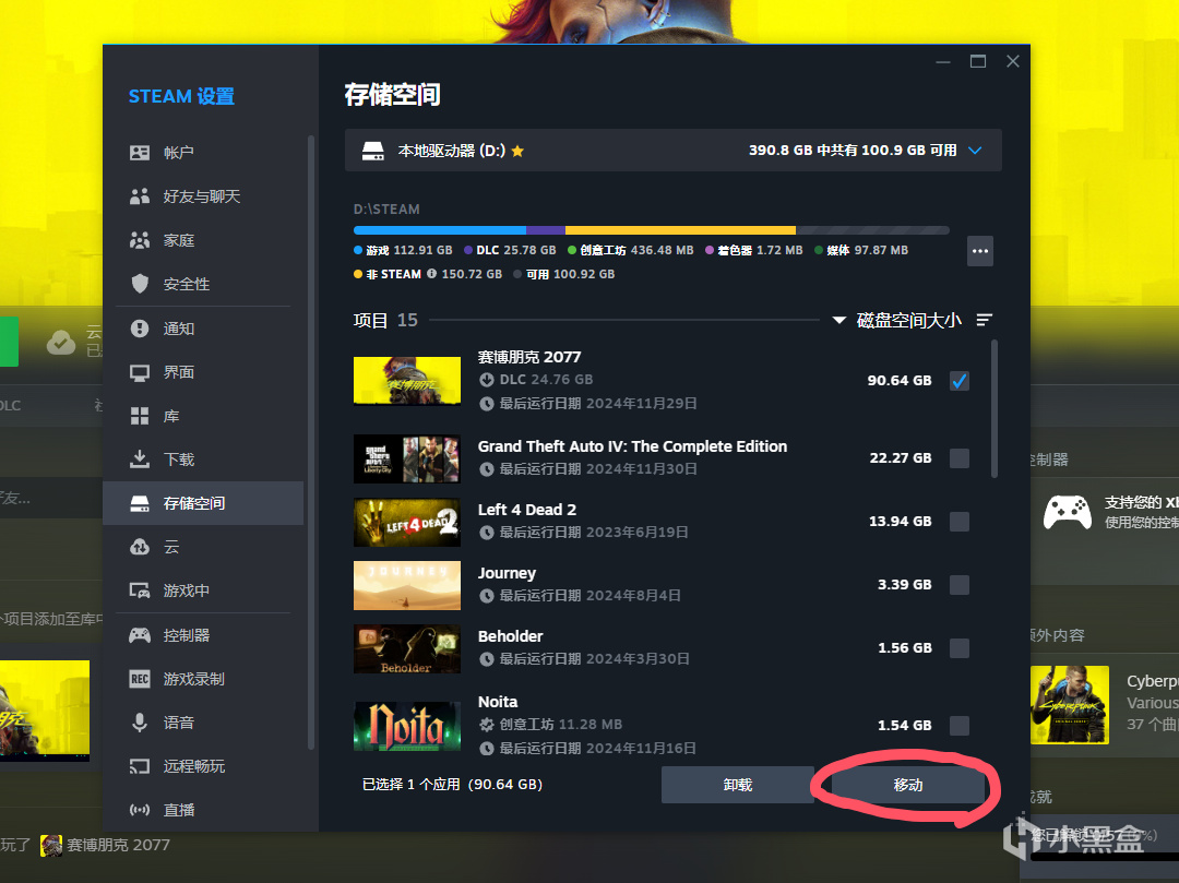 點擊Steam設置中的“存儲空間”,選擇一個遊戲就可以移動至其他硬盤中