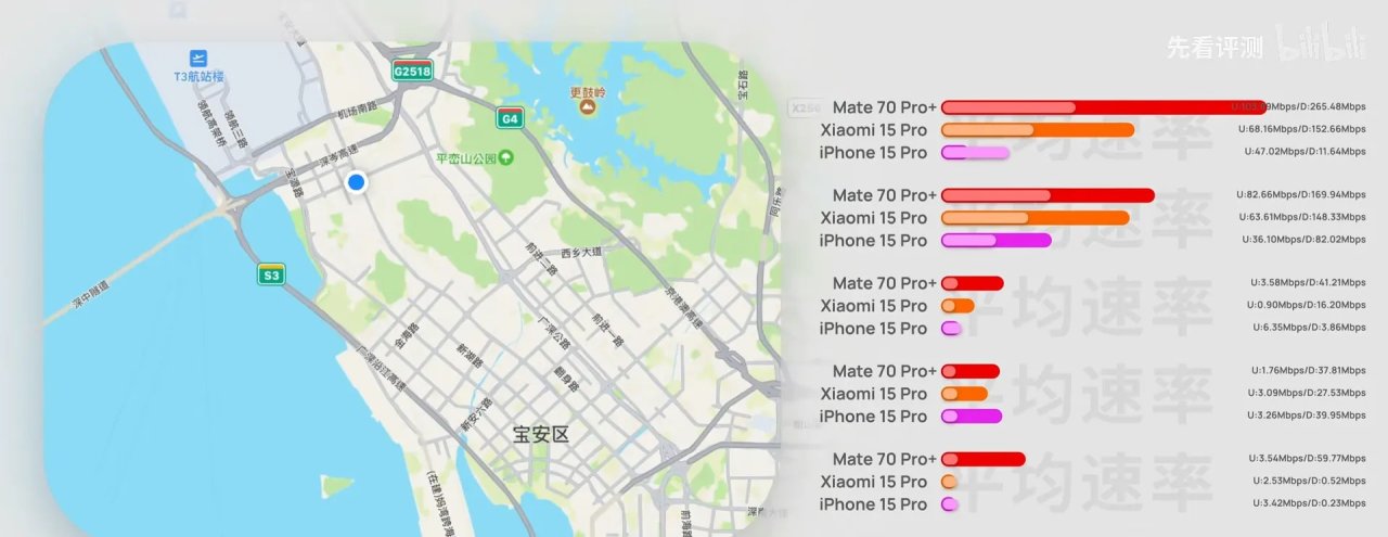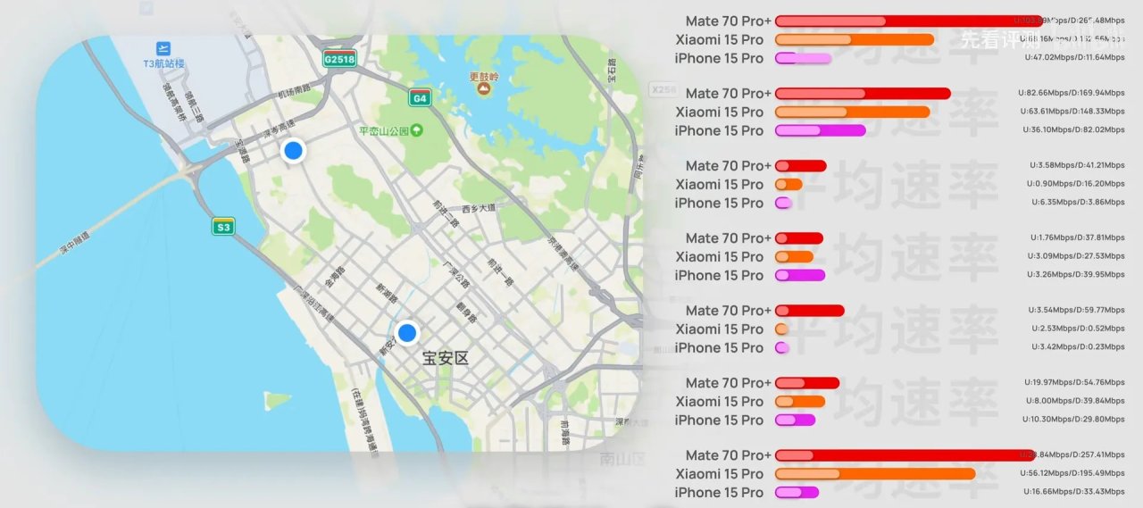 測試環境爲深圳市內的多個測試點,包括商業區、高速公路、居民區以及偏遠山區,分別對華爲Mate70 Pro+、小米15 Pro和iPhone16 Pro Max進行了測速。