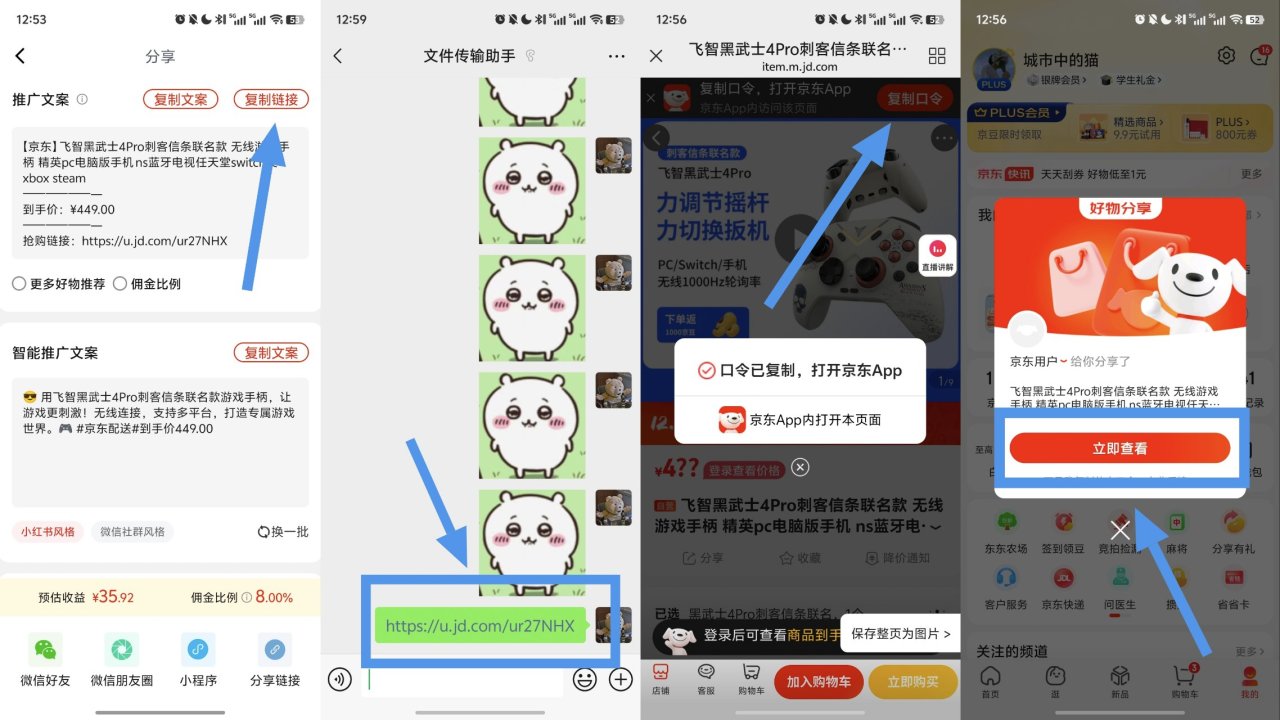然後複製推廣鏈接,可用微信發給自己→接着複製口令,打開自己的京東(一定需要通過此鏈接購買纔有返利)