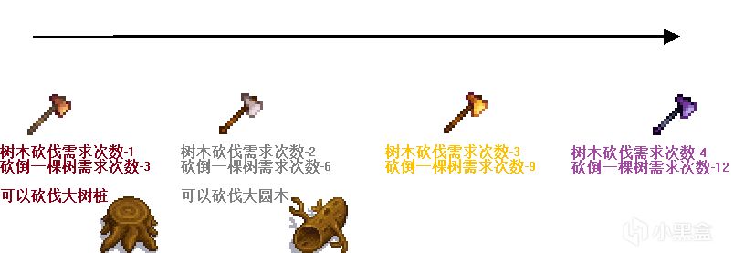 ⑤斧頭升級可以砍伐大樹樁,大圓木減少砍伐樹木的次數。