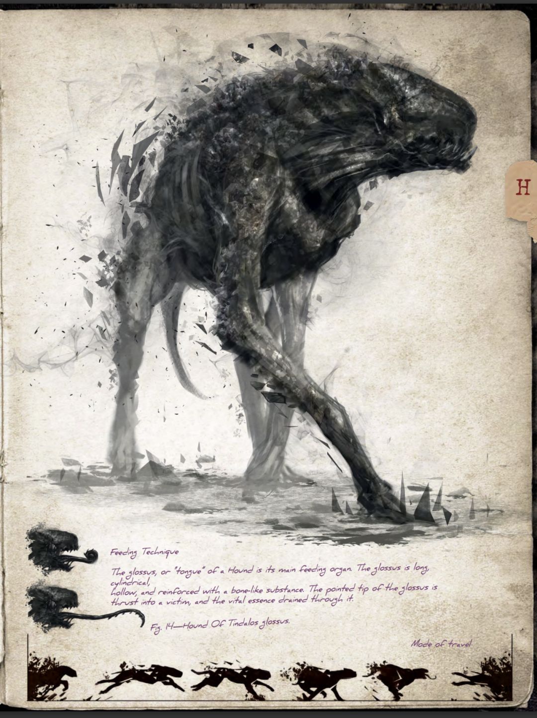 ● 廷達羅斯之獵犬(Hound of Tindalos)最初顯形時呈現爲一團煙霧,一旦成形,便很容易與空鬼區分開來。
