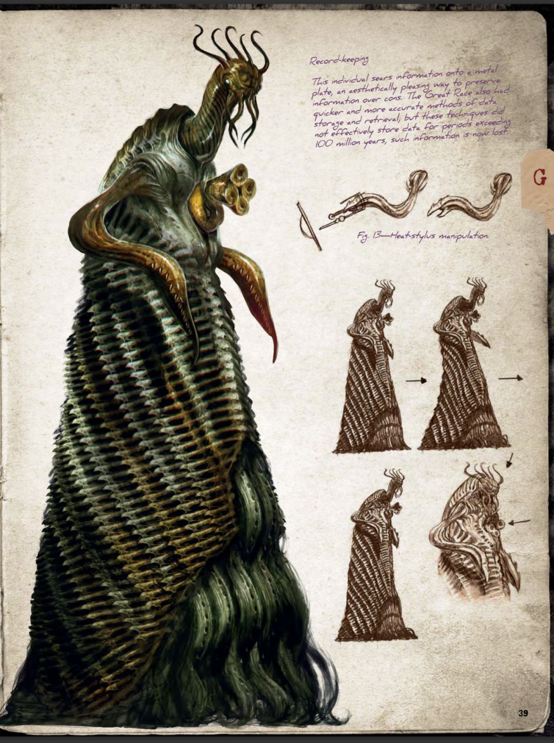 習性:偉大種族只接受液體食物。它們通過位於觸鬚後方的四個紅色喇叭形的器官進食。它們通過從肥大的、蝸牛狀的腳邊釋放某種孢子進行繁殖,這一活動總是在淺水中進行。