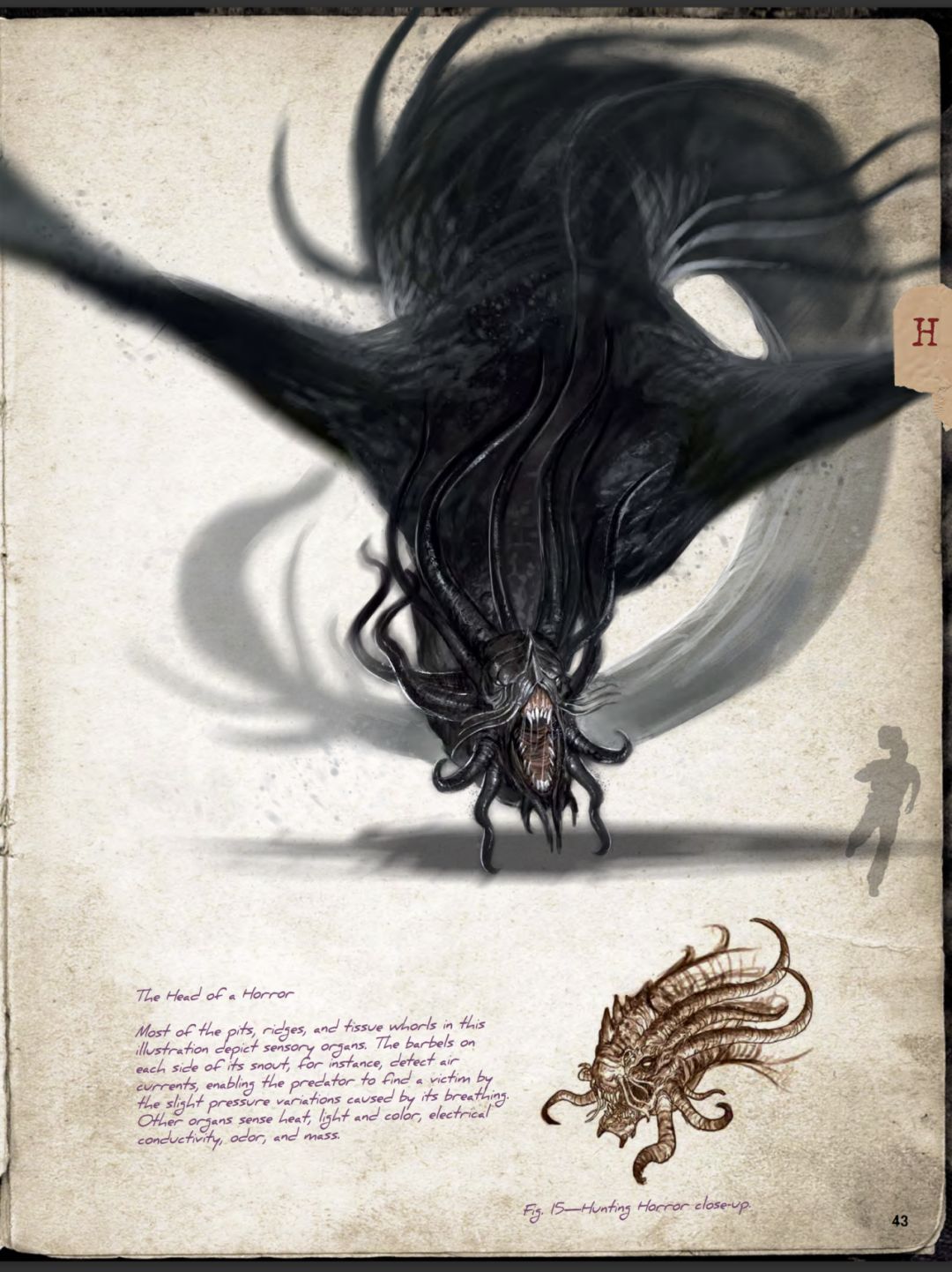 恐怖獵手不是由一般物質構成的。和猶格斯真菌一樣,它們同時存在於高維空間中。這種身形巨大的生物之所以能在高空中進行盤旋,也是由於翅膀對其它維度空間施加了某種作用。