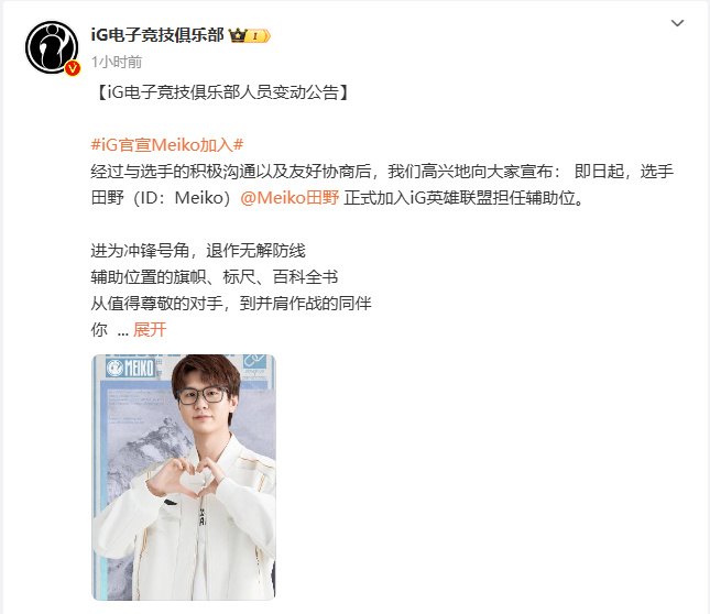 《英雄聯盟》iG戰隊官方公開了新賽季的選手陣容和教練組陣容。選手:TheShy、Jiejie、Rookie、GALA、Meiko,教練組陣容:梁大仁和元祥淵,期待iG新賽季的表現。