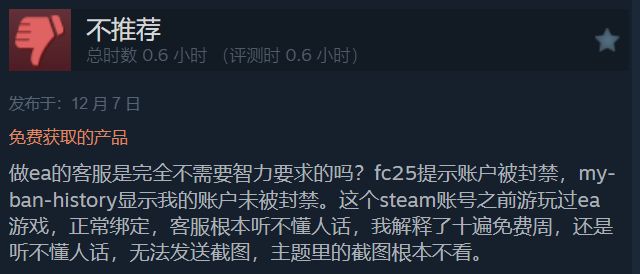 那麼爲什麼玩家紛紛給出差評呢?我們看到,玩家的差評主要集中在:遊戲連不上服務器,EA客戶端都登上去了,就是不讓玩;fc25提示賬戶被封禁,而客服根本聽不懂人話;免費試玩demo容量高達50GB,然而內容卻不多,只有沒幾隻球隊,而模式只有開賽。