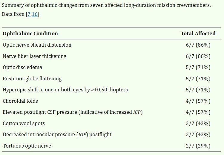 而這背後的 “ 元兇 ” ,還得是溜走的那部分重力。在太空裏如果呆的太久,大腦和脊柱周圍的腦髓液會大幅增加。這玩意兒一堆積,就會 “ 擠兌 ” 咱們的眼球,把它們壓得和煎餅似的,平的不能再平。