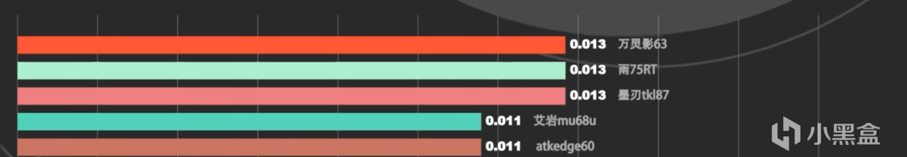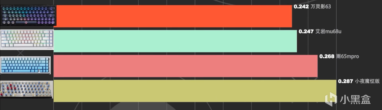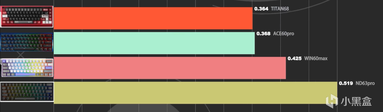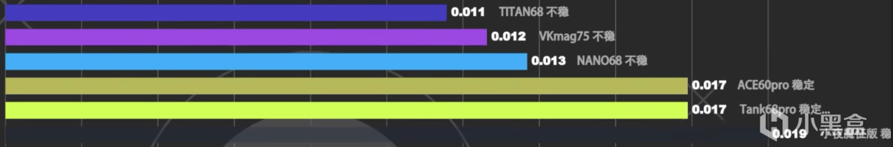 下面來到0.02精度的鍵盤,排在首位的是雨65mpro已經超越了一些0.01精度的鍵盤,還兼顧穩定性,下面是前行者的battle68V2和狼蛛WIN60MAX,然後是ND63PRO,最後是美加獅的mad60旗艦版。