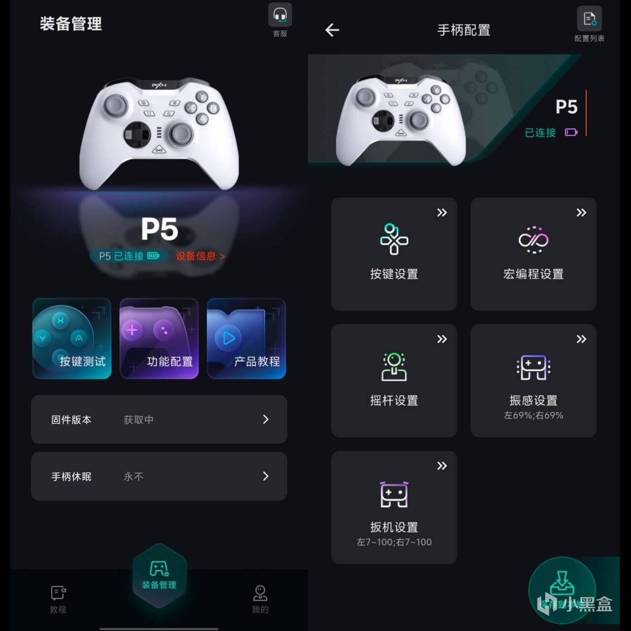 通過掃描說明書中的二維碼,可以下載手柄官方驅動APP,更新手柄固件版本,測試與校準手柄按鍵,手柄宏功能設置,以及調節搖桿靈敏度、震動強度、按鍵連發等諸多功能。