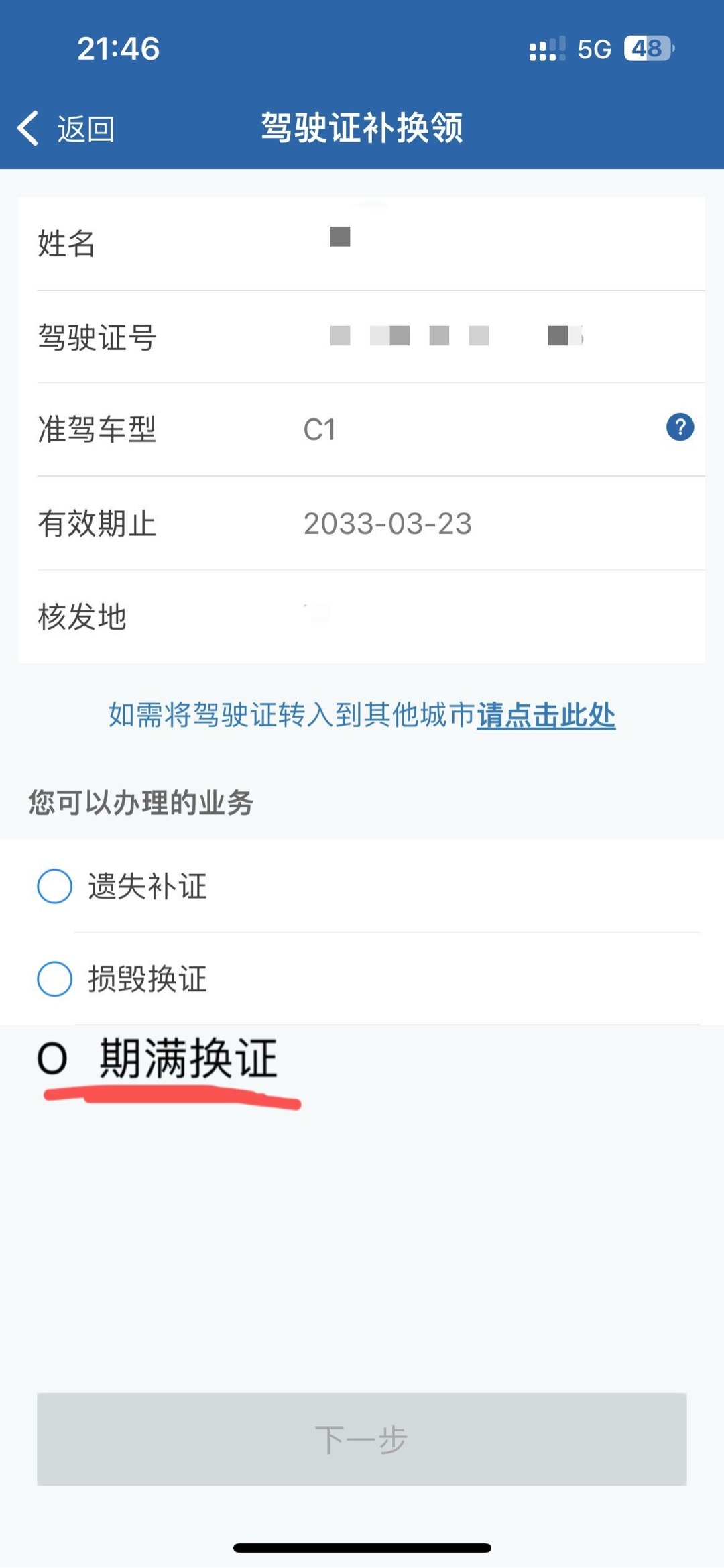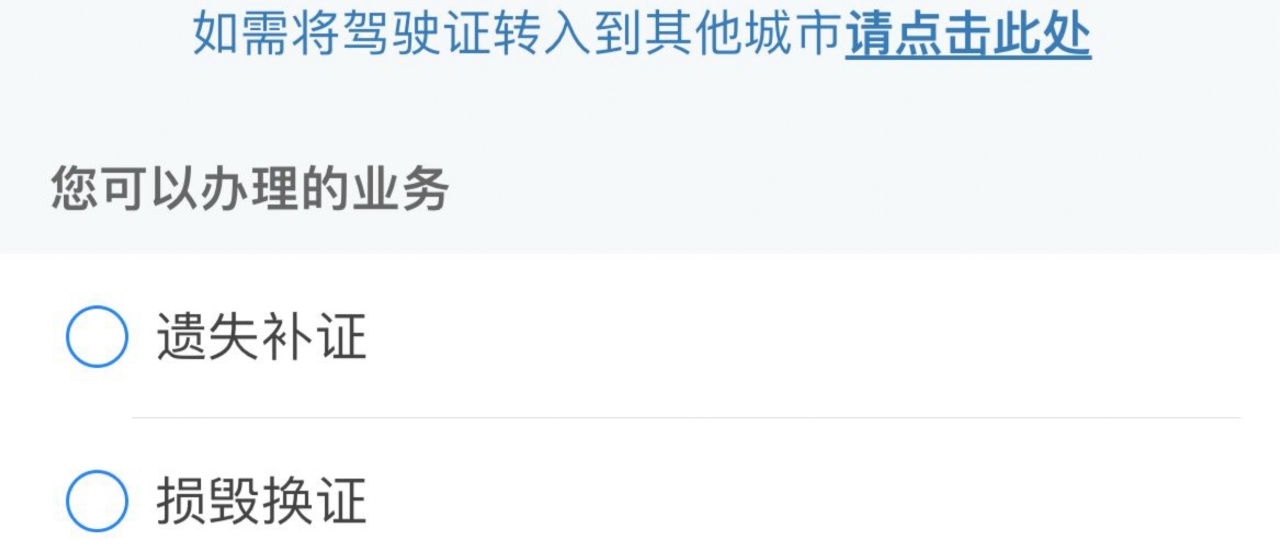 还是点击驾驶证补换领那个功能,如果你的驾驶证到期了,会显示下图的第三个选项,我因为驾驶证没到期,所以没显示,