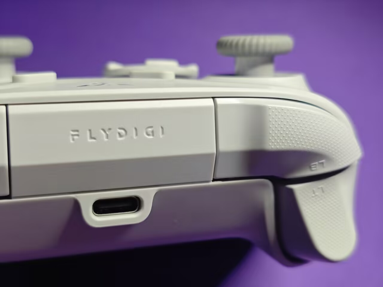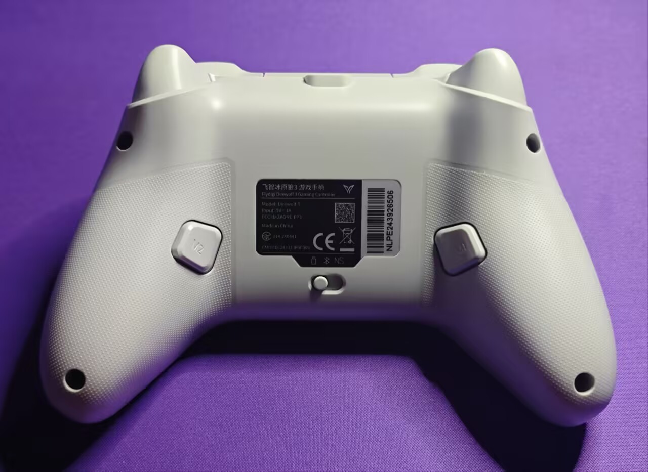 飛智冰原狼3的上方有一個“飛智”的英文名稱和一個C口的數據線接口,扳機是霍爾線性扳機,比碳膜扳機更順滑、更精準,肩鍵也是做了人提工學的曲線握感,不管怎麼去按都很舒。