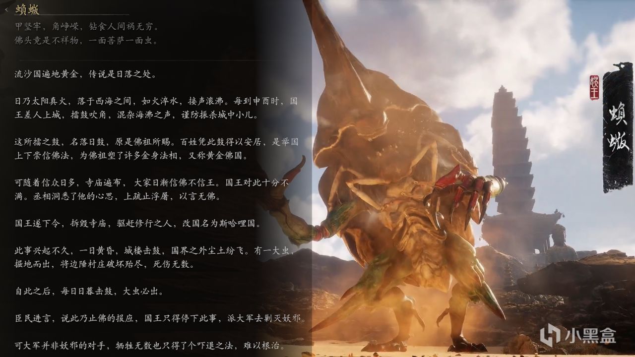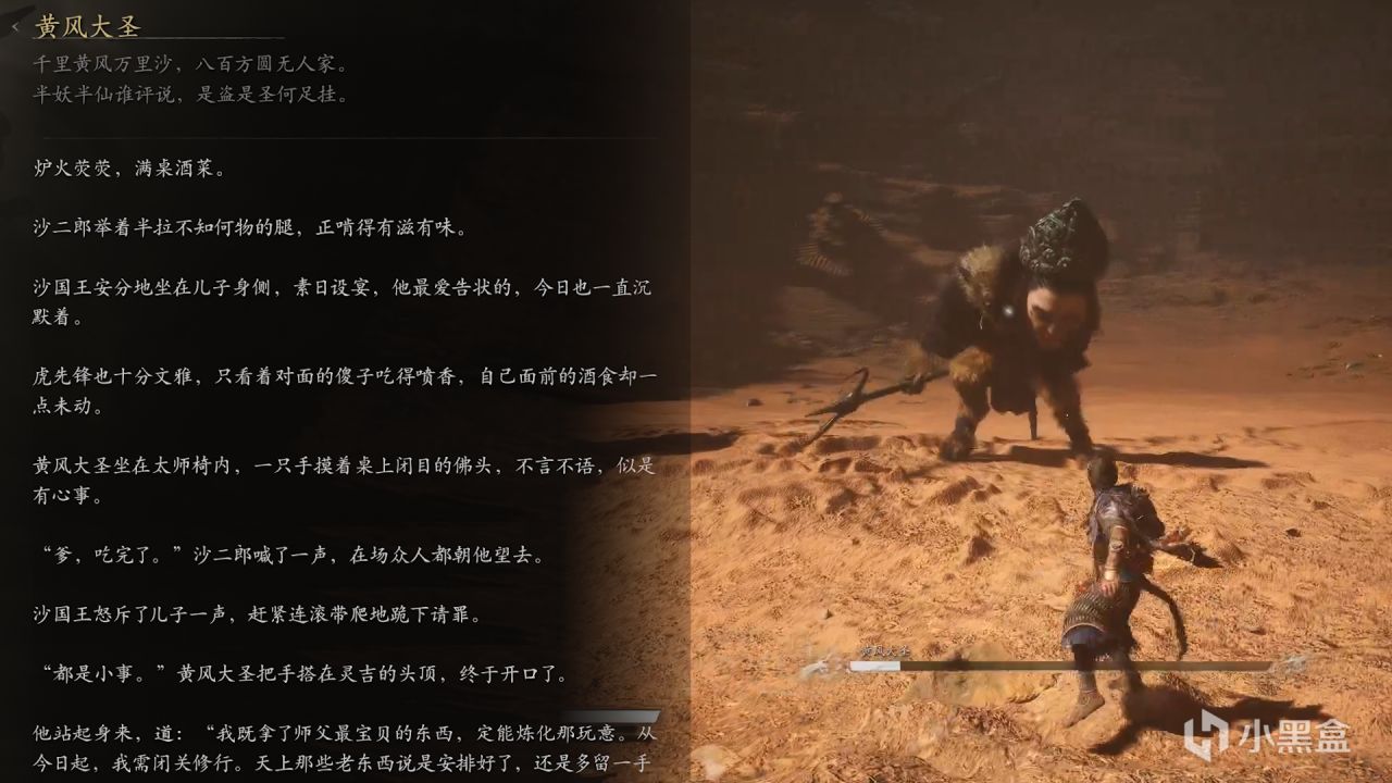 爲了能正常交談,天命人在定風莊的荒村中,爲其找來了一塊醒酒石。誰料這豬怪不識好歹,又要先去臥虎寺填飽肚子,只能隨他前去。喫飽喝足後,他談到消失的黃金之國估計就藏在此地,可能啊與那黃風怪也有干係。約定好在初見處碰頭,他想用來時大哥給的金片試上一試。