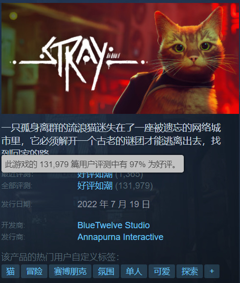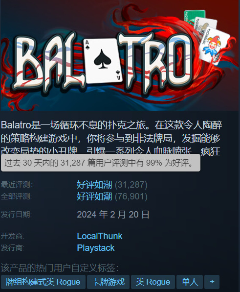 這便是《Balatro》目前的困境,畢竟「簡潔」雖然帶來了龐大的用戶基數,但同時也失去了部分深度——不過說老實講,以本作的市場成功這個批評顯然算不上“困境”,對它的討論就像回到了三年前的《Stray》,一方面你似乎看到各大遊戲羣都在抨擊,但回頭一看好評率:13W+評價、97%好評率!而《Balatro》因爲金搖桿的獲獎,過去一個月的評價條數也暴漲近一倍,好評率更是誇張的99%。