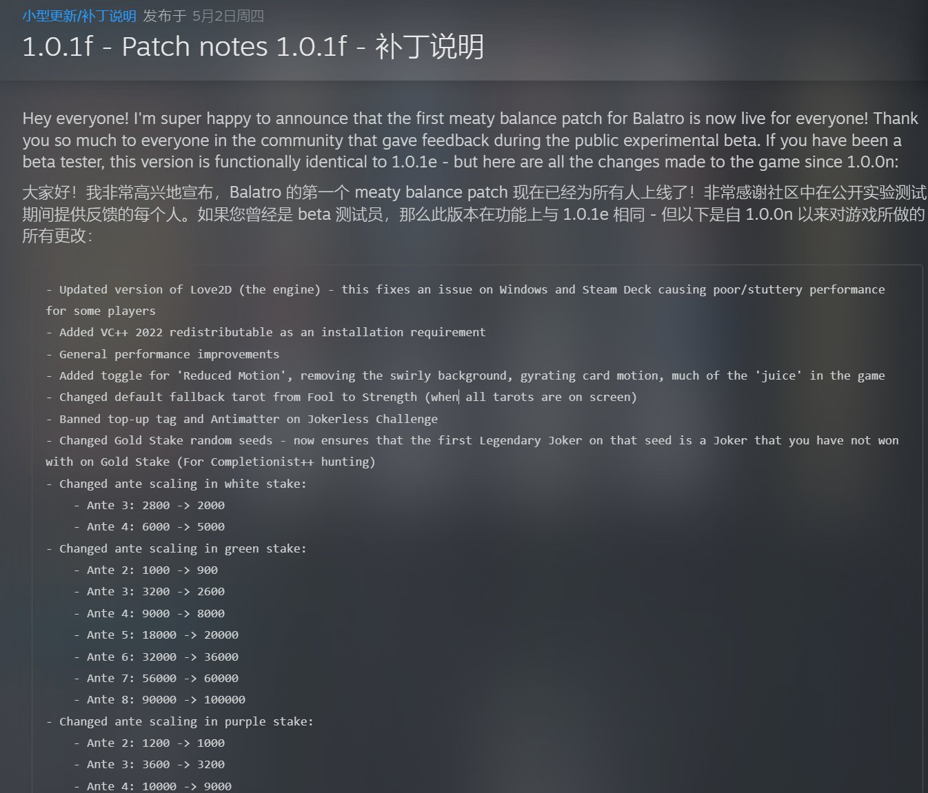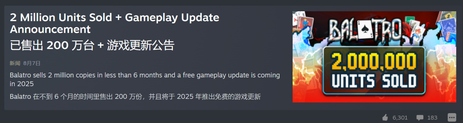 從遊戲的更新公告我們可以看到,作者LocalThunk在夏天宣佈了一個2025年即將到來的重大內容更新,然後就繼續躺平裝死了,這中間沒有任何有關小丑牌的平衡性優化,似乎打算“畢其功於一役”。當然遊戲已經如此成功,就算止步於此那也依然算得上是神作——前面再加個半步吧,至少20-30H的樂趣體驗是足夠的,那這對一款僅售50大洋(現在獨遊大漲價,標準價已經飆升到70檔了)的作品來講已經是物超所值。