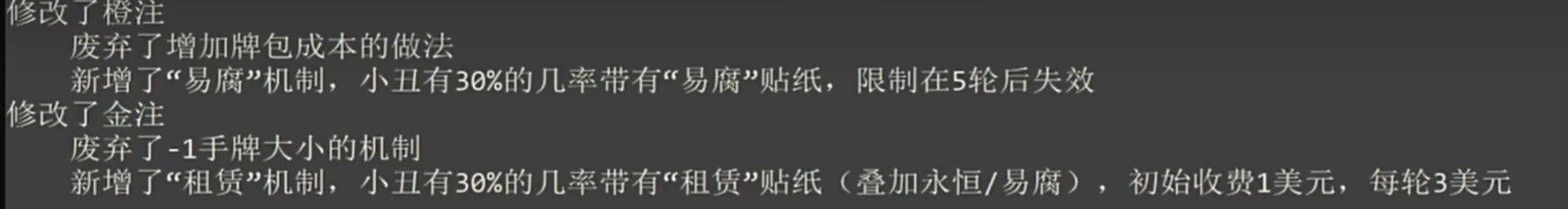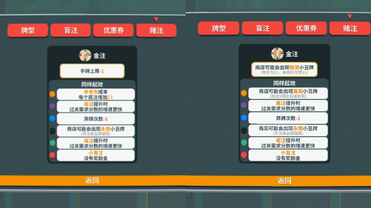 於是乎,在1.01更新之中,你可以看到製作人下調了所有等級的數值,讓遊戲變得更加輕鬆了。對於橙注、金注還有兩個根本性的優化:取消「卡包費用增長」以及「手牌-1」限制,轉而加入了「易腐」跟「租賃」兩個新機制。這其實還是在降難度,因爲「卡包費用增長」限制了星球卡/塔羅牌,大幅壓低玩家的數值;而「手牌-1」則是桎梏了牌型,因此金注往往都是高牌對子。