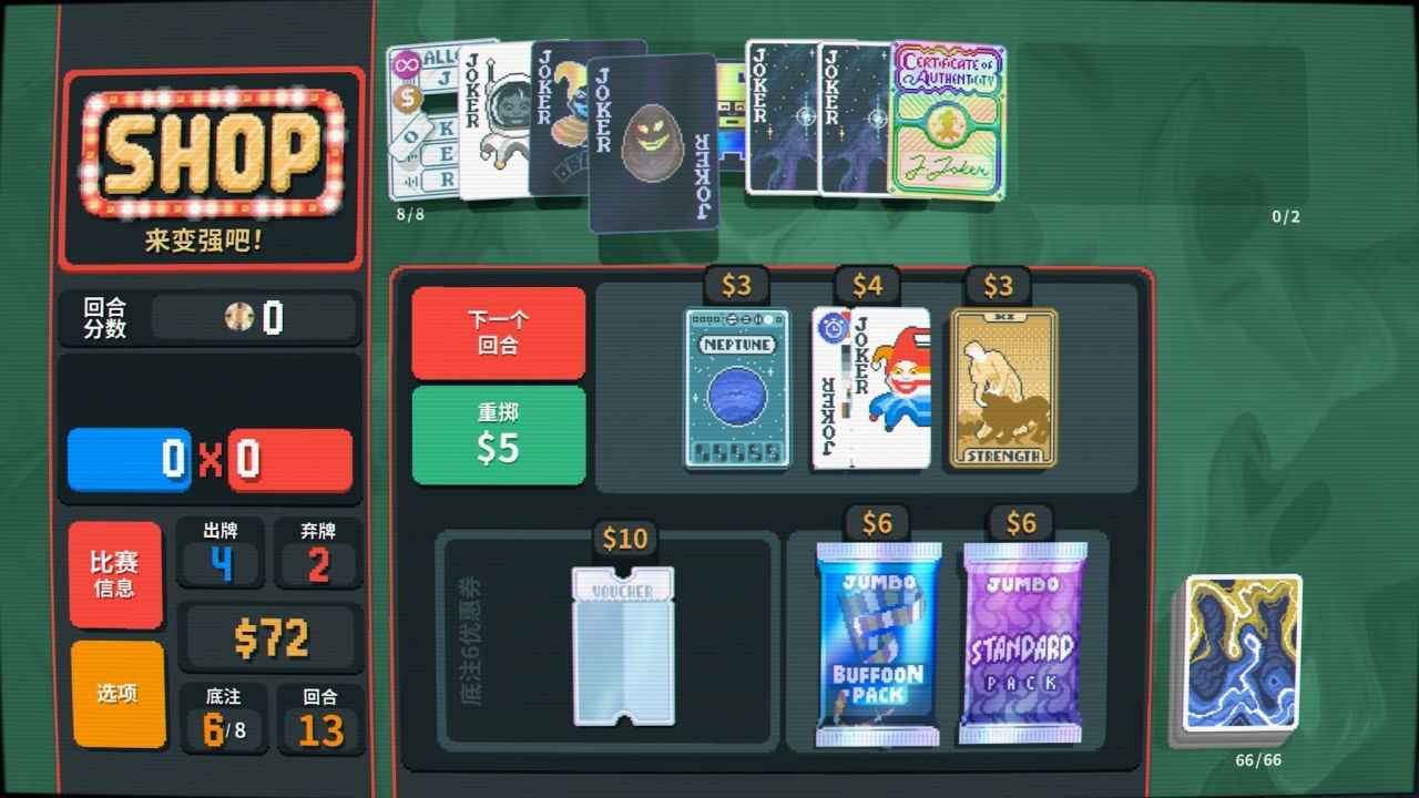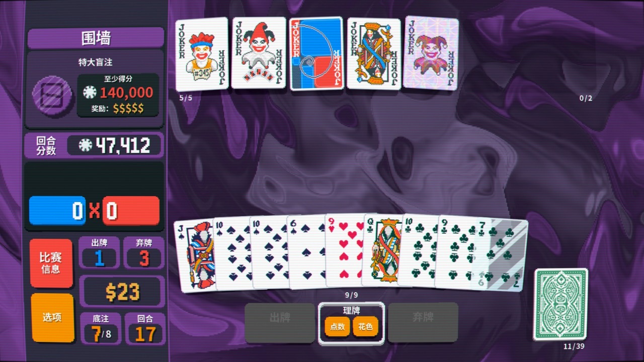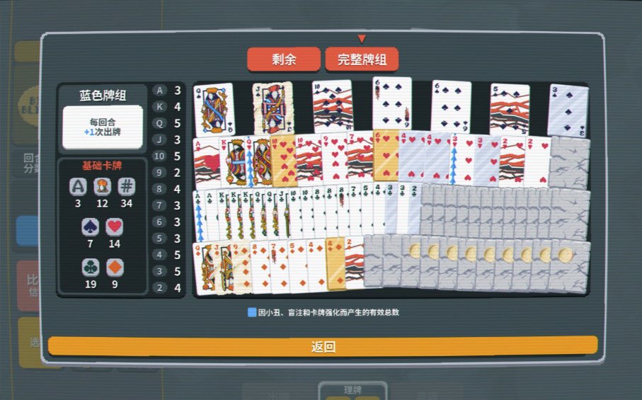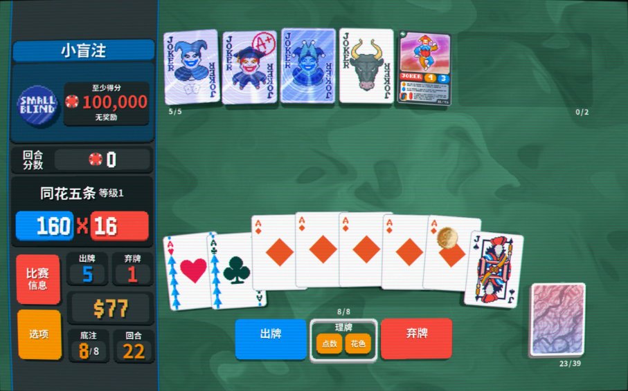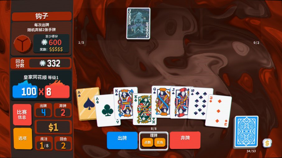 而在牌面的設計上則傾注了大量心血,每張小丑牌都有自己的特色,極具辨識度的同時爲玩家熟悉構築打下基礎,總共150種牌面也讓遊戲視效更加飽滿。總而言之,本作「簡約而不簡陋」的畫風,再加上魔性洗腦的背景音樂,讓遊戲在技術規格方面不至於成爲短板——看看《幸運房東》吧,一個因爲畫面過於勸退而使明珠蒙塵的典型例子。