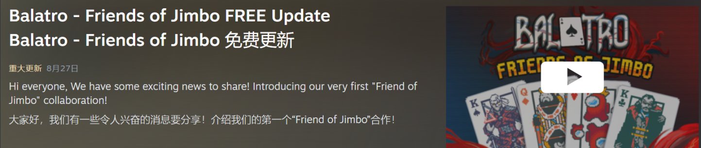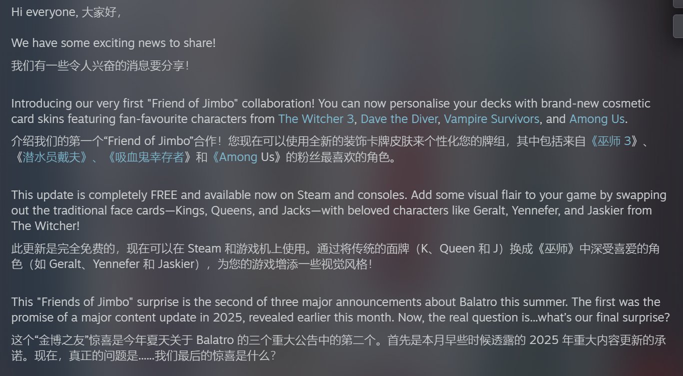 總之,這種不用花太多時間跟精力的聯動策略再一步證明了LocalThunk驚人的商業嗅覺,就像他從零開始做出了這部”年輕人的第一款德撲”(雖然是個策略肉鴿)《Balatro》一樣:那些用戶基數龐大的輕量級玩家纔是市場的根本,至於少數反對的不和諧音,who care?