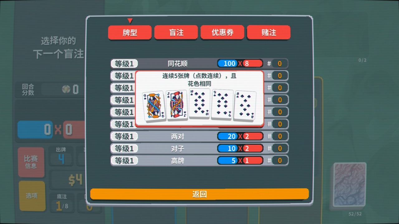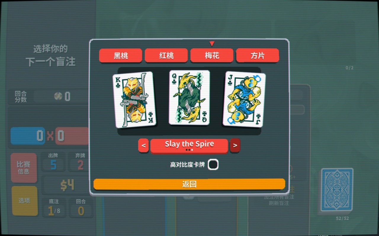 不得不說賭博是人類天性,“我可以不賭,但不能不看別人賭”,而德州撲克又是最能彰顯牌桌魅力的存在,早早就站到了撲克遊戲的最頂端。用德撲作爲載體極大降低了上手門檻,小丑牌不會玩,撲克牌難道還沒見過?那些牌型大家都耳熟能詳從小聽到大,你只需要湊一個最大的牌型打出去,剩下的就交給系統。相比較那些構築複雜的尖塔like,本作最大的優點之一在於上手簡單,熟悉的德撲牌型、簡化的遊戲目標和流程,減少了玩家初期的腦量計算,因爲你馬上要把精力投入到需要的地方去。