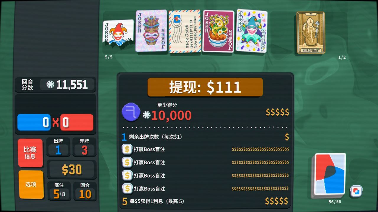 低門檻、易上手、強大的正反饋,這便是玩家對於《Balatro》最初幾個小時的印象。而實現這一點的根本,除了我上面提到的「62M的迷人像素」、被簡化的流程、傻瓜式的遊戲目標,最關鍵的部分還是要回到遊戲的構築核心:有且僅有5張的小丑槽位。
