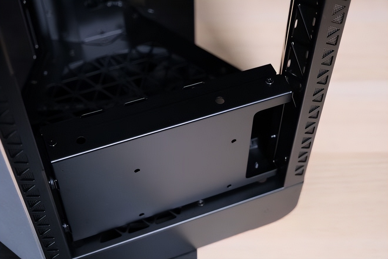 另一側是水冷冷排的散熱面,最大360尺寸的水冷冷排安裝位置,同樣三角形的側板開孔,超大面積的散熱網側板下面是固定冷排倉位,同時在上下都預留了線纜的出線口。