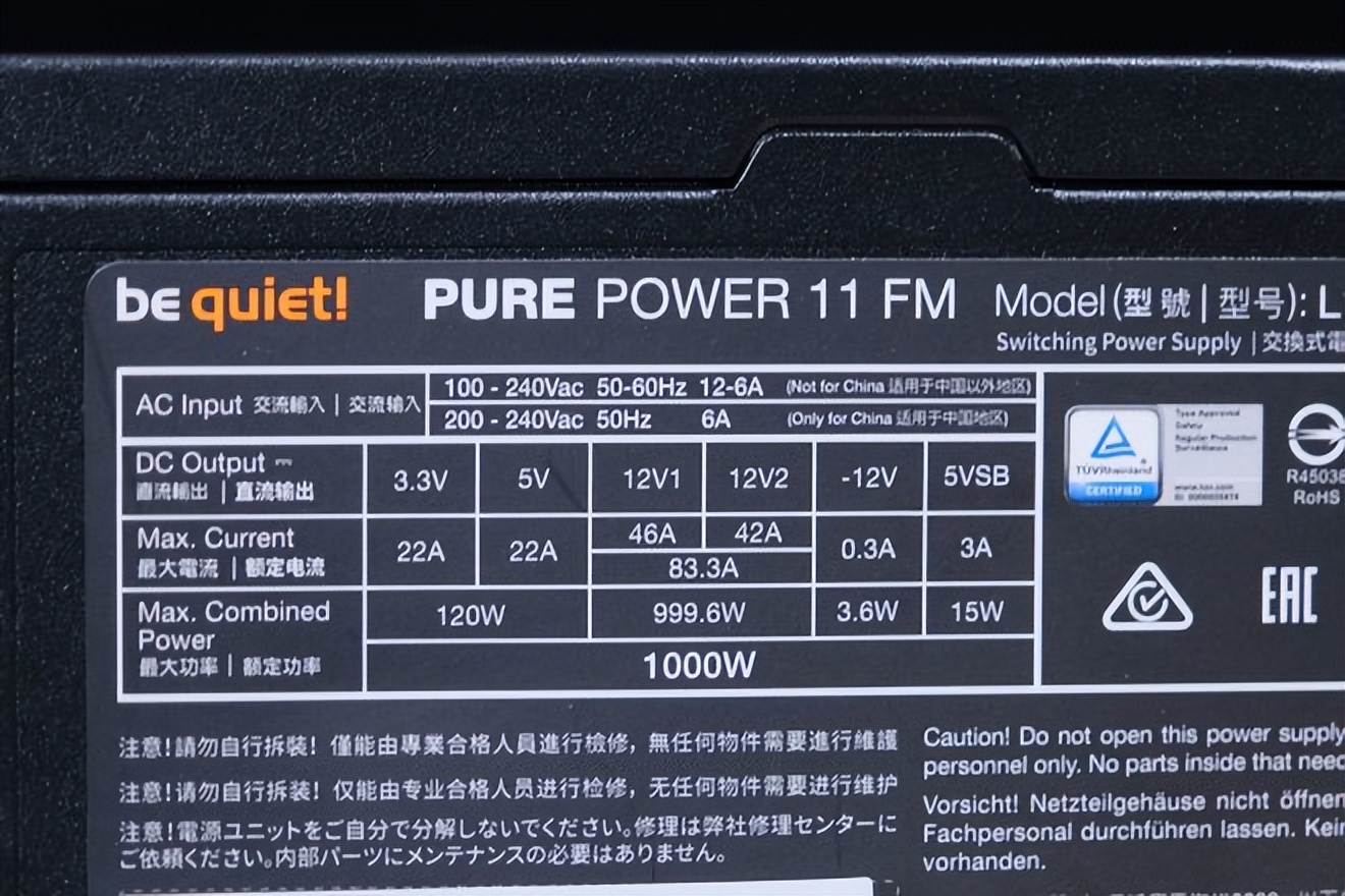 德國必酷Pure power 11FM1000W,全模組線纜、額定1000W功率、80 PLUS金牌認證,標準的ATX尺寸。提供雙路12V輸出,最高可達46A和42A,合併輸出999.6W,應對旗艦級別顯卡妥妥的。